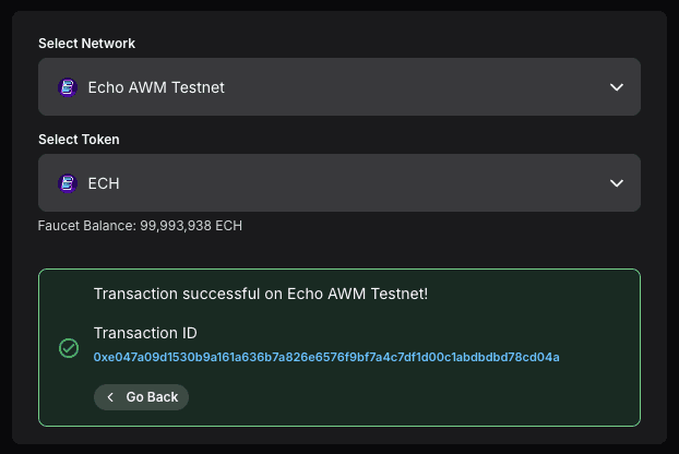 We’ve funded the new wallet that was generated for our user with some ECH tokens from the Echo AWM Testnet Faucet.