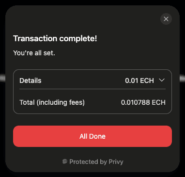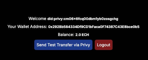 Now that we have a balance, we can send some ECH tokens to another recipient via Privy to test Privy's sendTransaction flow. Privy provides the following hook for this: